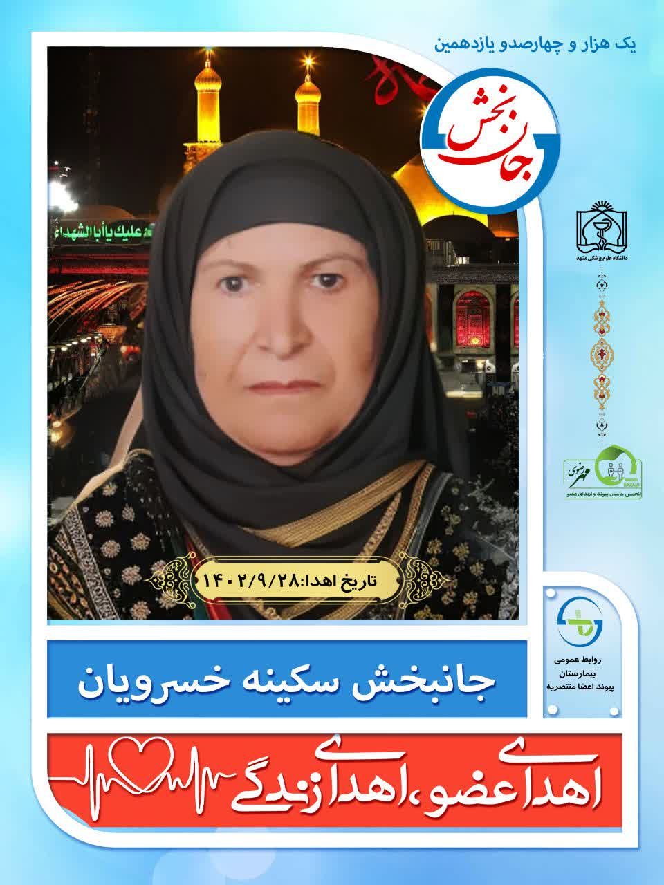 وی تصریح کرد: قرنیه های زنده یاد سکینه خسرویان جهت پیوند به بانک چشم دانشگاه علوم پزشکی مشهد و قسمتی از پوست مرحومه برای پیوند به بیماران بخش سوختگی بیمارستان امام رضا(ع) مشهد ارسال شد.