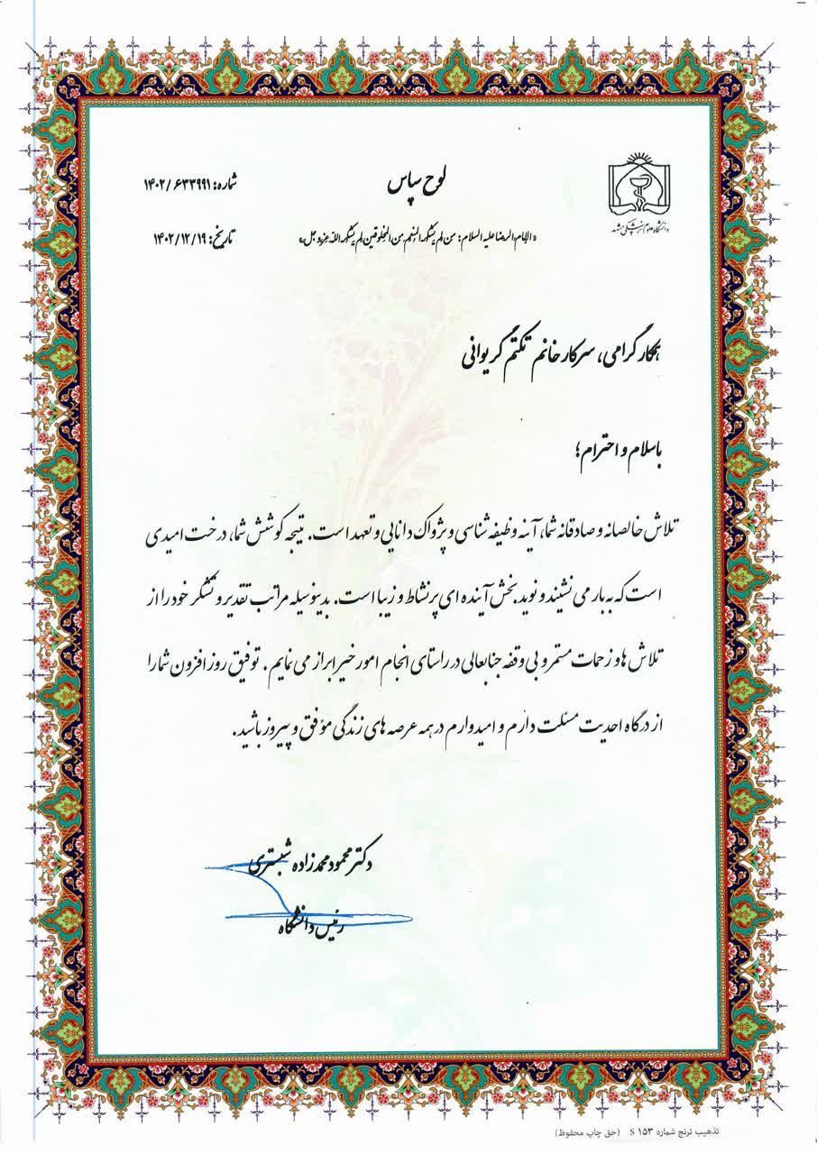 تقدیر رئیس دانشگاه علوم پزشکی مشهد، جناب آقای دکتر محمود شبستری از عملکرد مناسب دبیر شورای مشارکتهای مردمی بیمارستان طالقانی سرکار خانم گریوانی