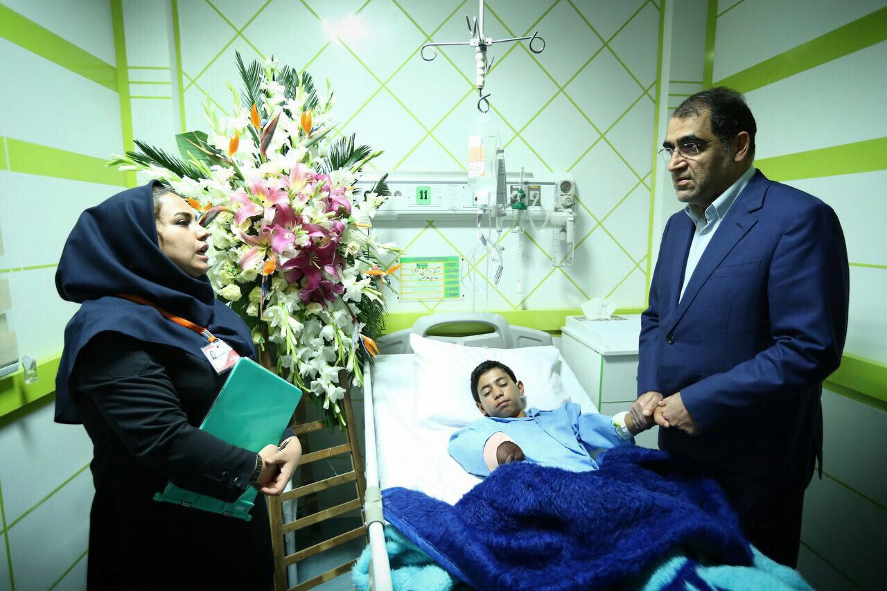 در حادثه ای تاسف بار که دانش آموز محمدامین 14 ساله حین کار با چرخ گوشت دستش به درون چرخ کشیده و تا بالای مچ قطع شده بود، به این مرکز اعزام و تحت درمان قرار داشت. وزیر محترم بهداشت بعد از اطلاع از موضوع به همراه هیئت همراه برای عیادت بر بالین بیمار آمده و از ایشان دلجویی نمودند. در این عیادت رئیس محترم بهزیستی هم ضمن دلجویی و صحبت با ایشان قول مساعد جهت تهیه پروتز به ایشان دادند.