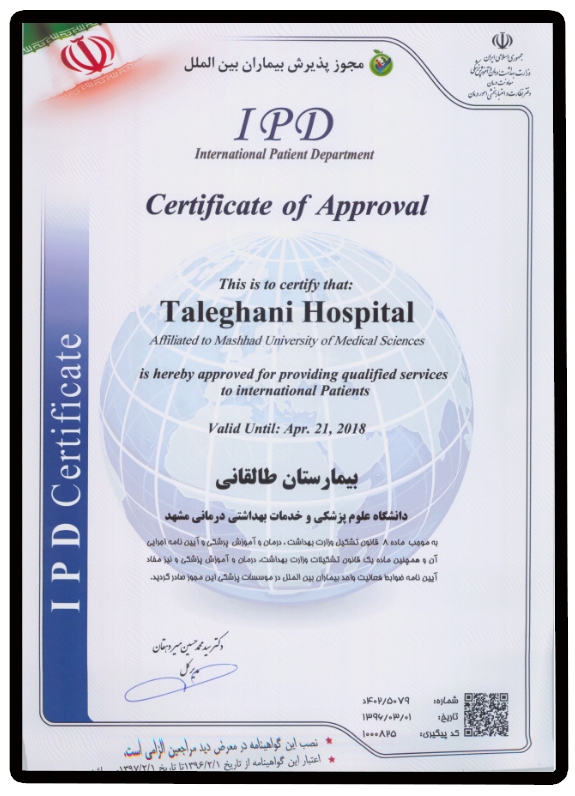 این مرکز که تا قبل از این مجوز شش ماهه جهت پذیرش بیماران بین الملل داشت ، اکنون موفق به کسب مجوز یکساله از وزارت بهداشت جهت پذیرش این بیماران شده است. لازم به ذکر است که این مرکز اولین بیمارستان دولتی مشهد است که دارای مجوز پذیرش بیماران بین الملل می باشد. | ||