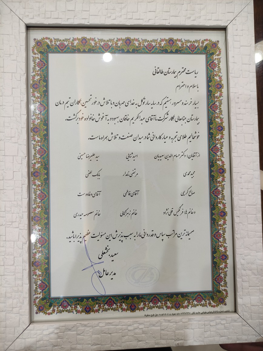 مراسم تقدیر شرکت پویا گستر باحضور دبیر شورای مشارکتهای مردمی بیمارستان از زحمات ریاست بیمارستان طالقانی ، مدیریت و مدیر خدمات پرستاری و پرسنل اورژانس و همچنین تقدير و تشکر ویژه از متخصص طب اورژانس مرکز آموزشی، پژوهشی و درمانی طالقانی جناب آقای دکتر سعیدیان برای احیاء موفقیت آمیز کارگر جوان شرکت پویا گستر.